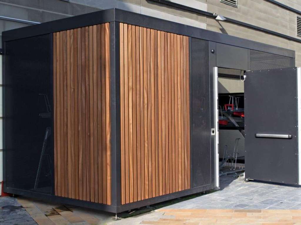 Conçu et réalisé dans nos ateliers de Montpellier, il est habillé de tôles d’acier perforées et de bardage bois FSC ajouré pour permettre un éclairage naturel et une bonne ventilation tout en garantissant une sécurité optimale. Il est également équipé d’un éclairage LED à détection de mouvement pour en faciliter l’usage et d’un système d’ouverture automatisé avec barre anti-panique de sortie.