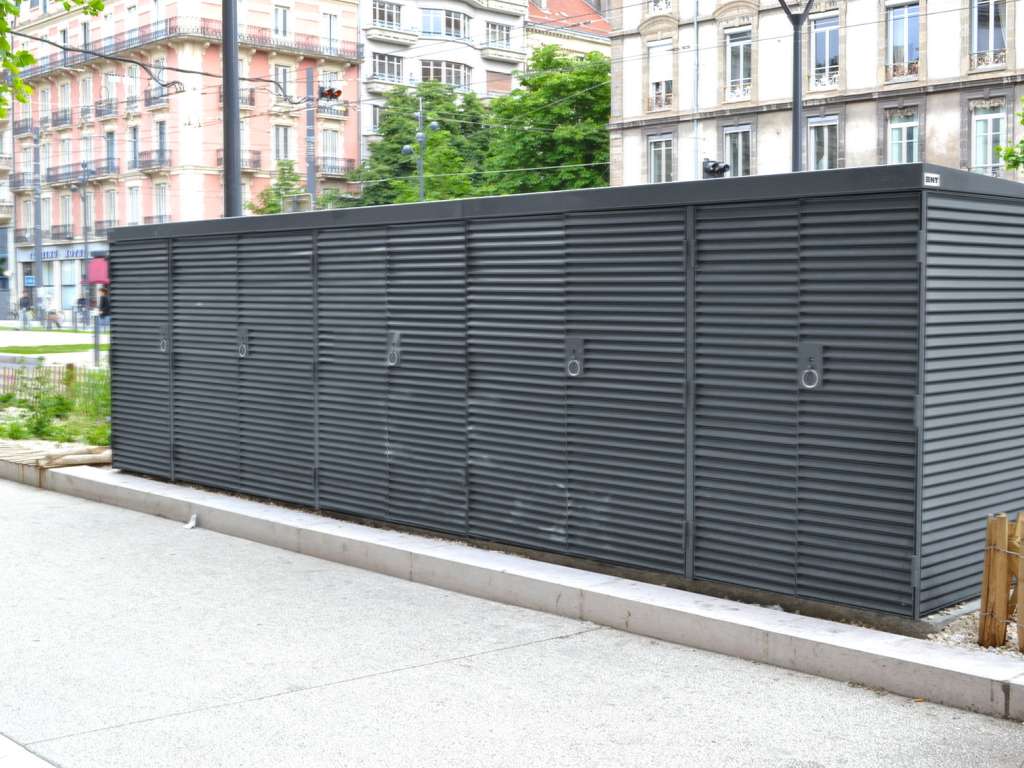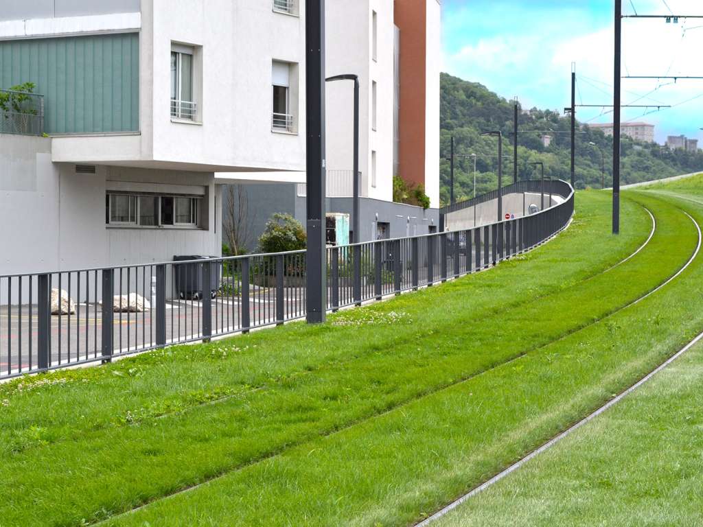 Garde-corps acier à barreaudage vertical bordant les voies de tramway