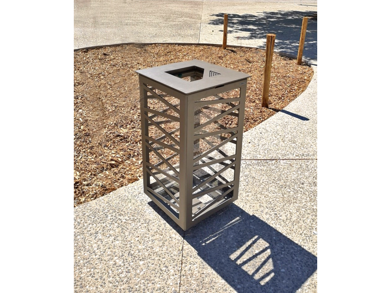 Corbeille acier section motif TREILLE découpé laser avec couvercle pivotant et porte sac Parois intérieures en plaques de polycarbonate transparent