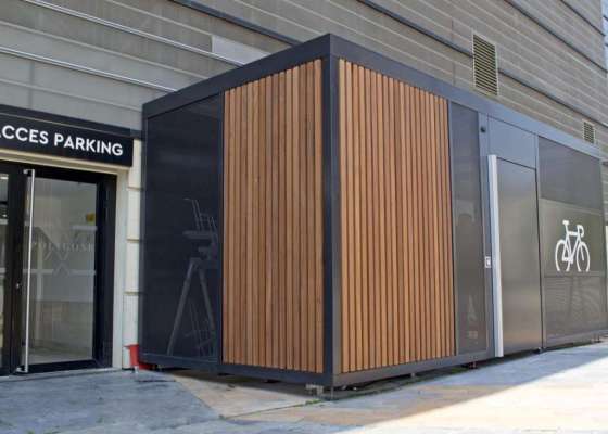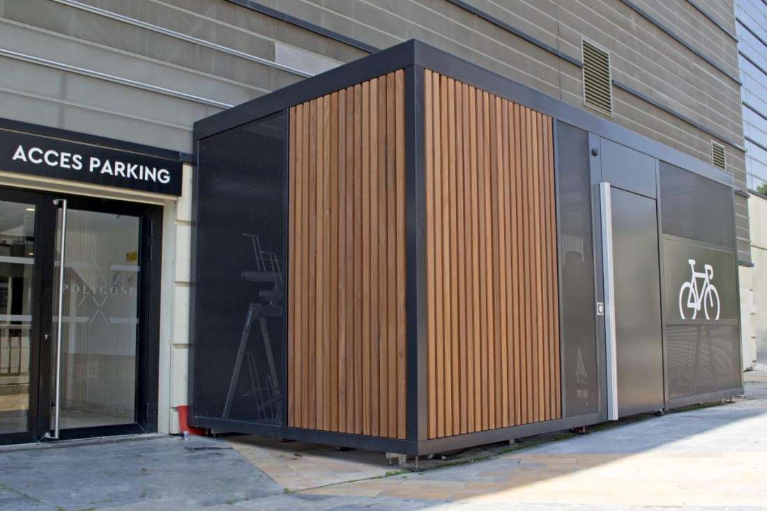 Fourniture et pose d’un abri vélo sécurisé collectif de 24 places avec contrôle d’accès et éclairage à détection pour Syndexia, le syndic du Centre Commercial le Polygone à Montpellier (34).