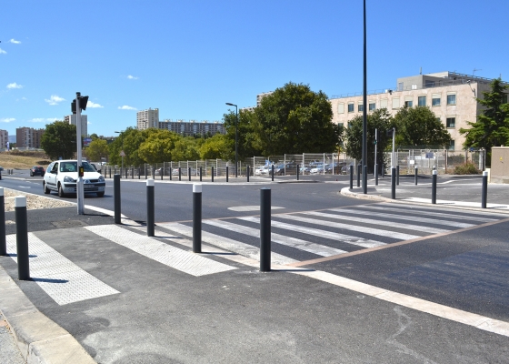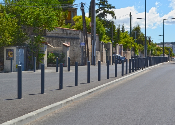 Aménagement constitué de barrières et potelets coniques