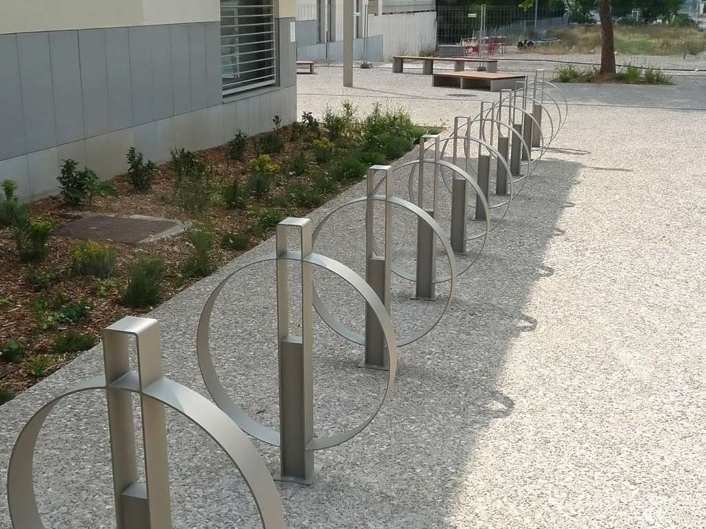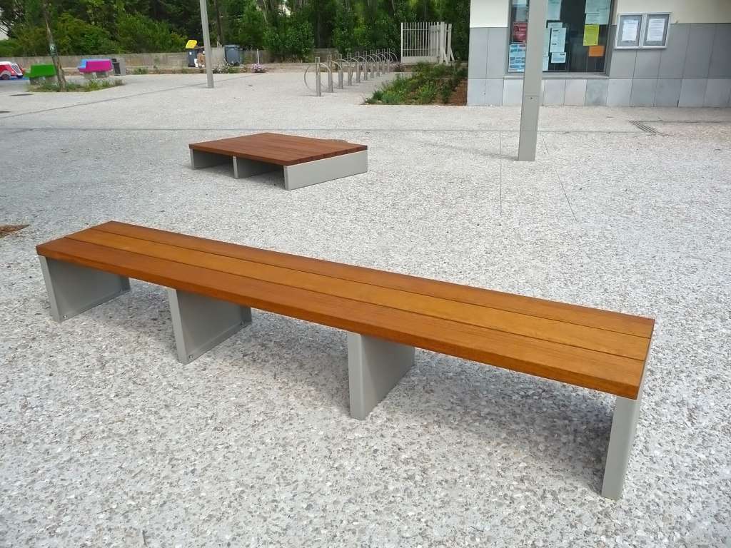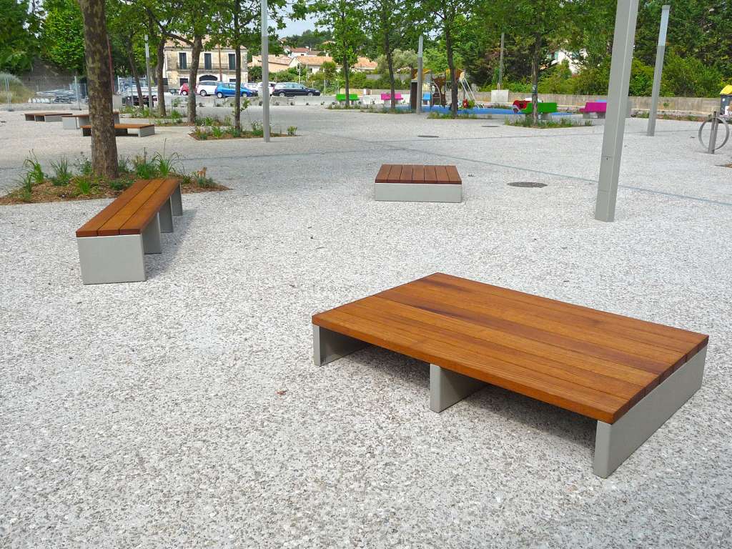 Aménagement de la place de l'école de Saint George d'Orques, par banquettes en acier et bois exotiques et appuis vélos thermolaqué RAL 2800 Sablé